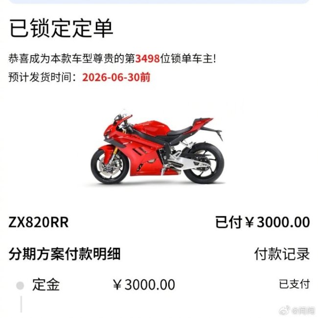 张雪机车820RR-RS赛车在WSBK葡萄牙站SSP组别连续两回合夺冠,打破欧美日品牌百年垄断,成为中国摩托车工业的重要里程碑。捷报传回国内,消费者对民用版820RR的购买热情迅速高涨。据多地门店反馈,夺冠后72小时内,820RR订单量突破3500台,总锁单排序达3498位以上。济南、青岛等门店单日客流量增长100%,青岛店单日订单达15台。基础版(43,800元)与高阶版(61,980元)均需排队,小程序显示提车时间普遍排至6月30日,部分门店甚至延至7月。